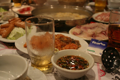 En esta foto vemos de fondo el caldero donde vamos a ir cocinando los distintos ingredientes que acompañan al hot pot. Alrededor: pescado, carne, salchichitas, dumplings… entre otros, listos para ser sumergidos en el caldo.
