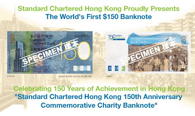 Esta mañana a través de unos twiteros que sigo en Hong Kong (JayOatway), ha llegado a mi esta noticia en la cual el banco Standard Chartered en conmemoración de su 150 aniversario, va a sacar un billete de 150 HKD. Como muestra en la foto inferior podemos ver lo que será el diseño del billete conmemorativo.