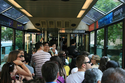 Se puede llegar de forma fácil a donde se coge el tranvía, subiendo por el lateral cerquita de la Torre del Banco de China. De todas formas, está bastante bien señalizado y se sabrán orientarse muy bien. El día que subimos al pico con el tiempo tan bueno que hacía, normal que la gente hiciera algo de cola para subirse al tranvía. Los vagones a tope de gente, la expectación crece a medida que vamos subiendo…